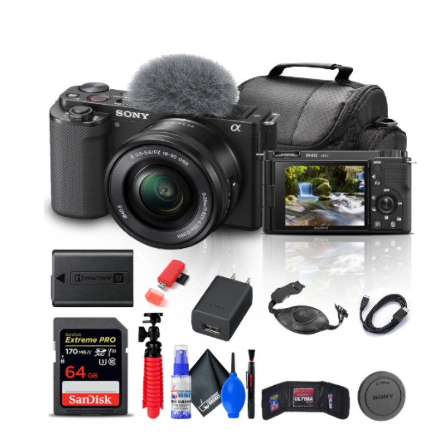 The Sony ZV-E10 with the 16-50mm lens is a mirrorless camera designed for vlogging and video creation.It features a 24.2MP APS-C sensor, capable of shooting 4K video at 30fps and Full HD at 120fps. The camera includes features like a side-articulating touchscreen, Fast Hybrid AF system, and a directional 3-capsule microphone, optimized for vlogging. The 16-50mm lens offers a versatile zoom range, suitable for various shooting situations.