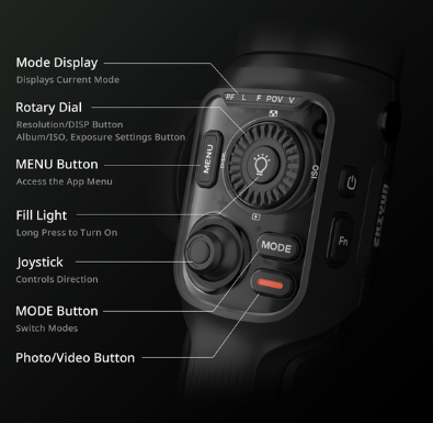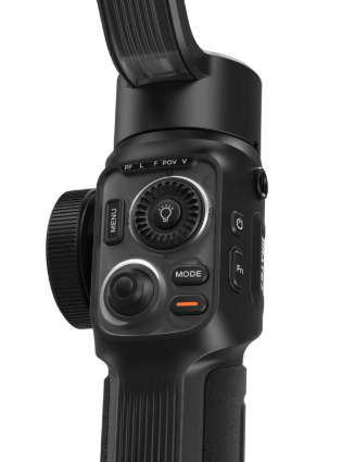 All-in-One Control Panel — includes joystick, rotary dial, mode buttons, and fill-light controls for seamless on-gimbal operation.
